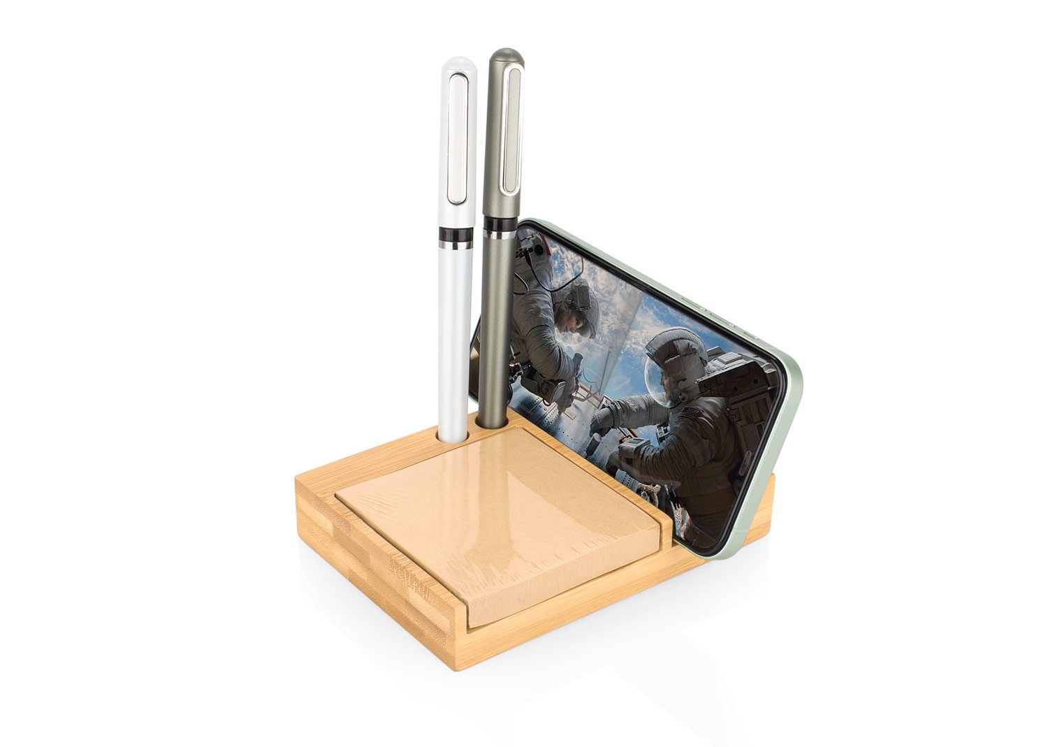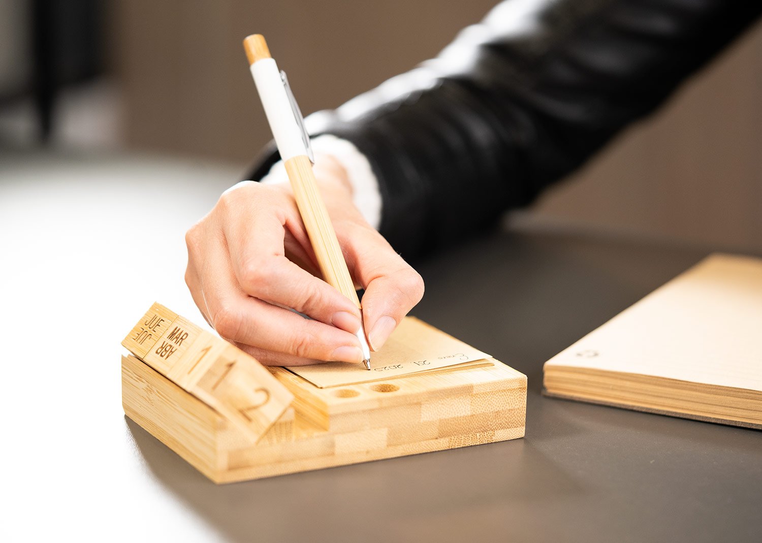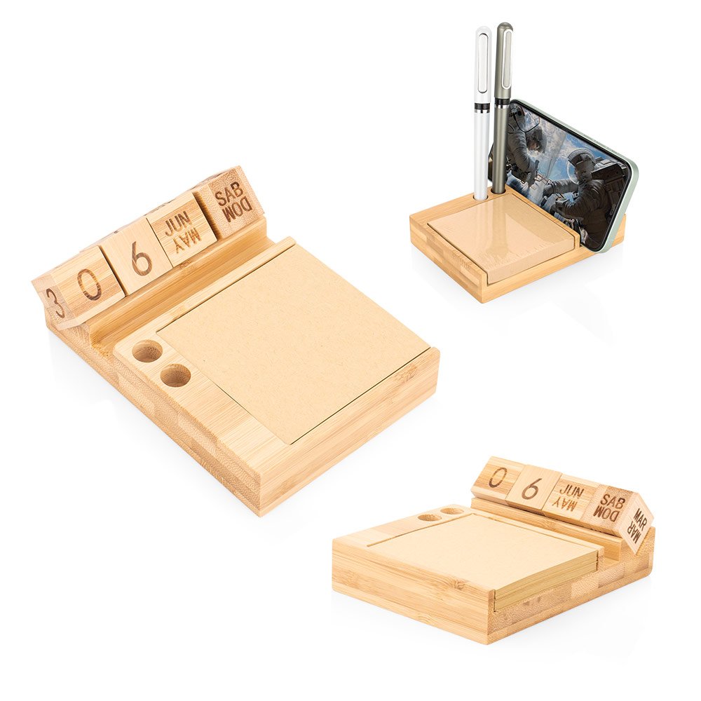 Porta notas de bambú con calendario perpetuo que muestra día, fecha y mes de forma continua, sin necesidad de reemplazo anual. Incluye 4 bloques giratorios de madera (2,3 X 2,3 X 2,3). Contiene 100 hojas de papel tipo kraft (7,6 X 7,6) y compartimentos para bolígrafos o accesorios. Diseño funcional y ecológico para escritorio. Material: Bambú Medidas: Formato: (Ancho X Alto X Profundo): (13,2 X 9,5 X 2,6). Peso: 203 gr.