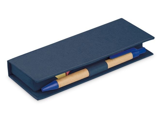 Estuche de cartón con bolsillo para regla de 12 cm, 2 memos de color con 110 hojas c/u y 5 banderas adhesivas en papel de diferentes colores. Incluye bolígrafo ecológico y porta bolígrafo.