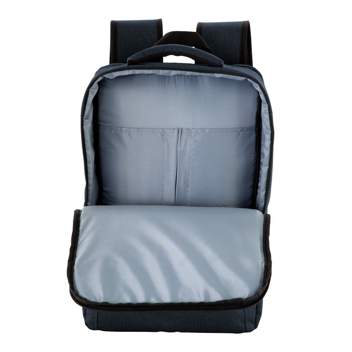 Mochila portanotebook de hasta 16 pulgadas. Cuenta con dos compartimentos: Compartimento posterior con cierre, bolsillo portanotebook de hasta 16 pulgadas con tira de seguridad con cierre de velcro y bolsillo plano con cierre . Compartimento frontal, exterior con bolsillo con cierre horizontal y bolsillo vertical con cierre impermeable, interior con bolsillos organizadores y un bolsilo de red. Asa acolchada y reforzada para mejor traslado. Espalda acolchada con red que permite ventilación. Tira para sujetar la mochila en la manija extensible de un equipaje de mano y bolsillo de seguridad con cierre. Correas acolchadas. Tiradores de cierre metálicos. Medida: 30 x 44 x 12 cm. capacidad: 15 litros.