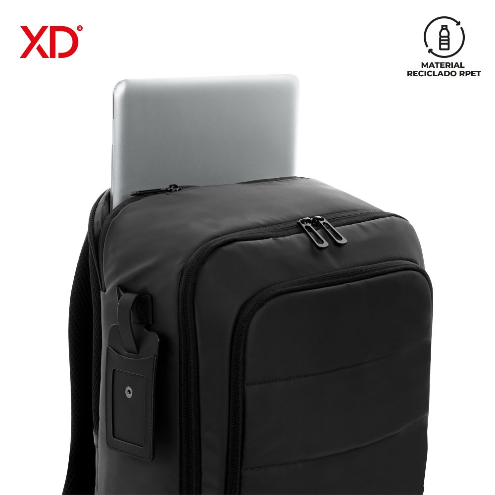 Morral backpack en poliéster y poliuretano reciclado RPET. Con cinco bolsillos externos con cremallera. Apto para portátil de 15”. Bolsillo escondido en el espaldar. Banda posterior para enganchar en trolley. Espaldar acolchado. Incluye identificador. Medidas: 41 cm x 29 cm x 12 cm.