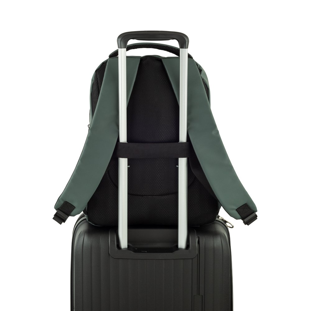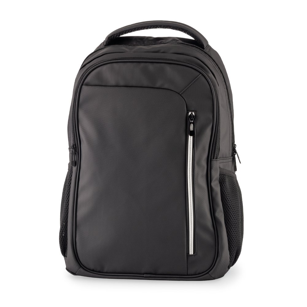 Morral backpack en poliéster. Dos bolsillos laterales con malla y tres bolsillos externos con cremallera. Apto para portátil de 15”. Banda posterior para enganchar en trolley. Espaldar acolchado. Medidas: 41 cm x 29 cm x 12 cm.