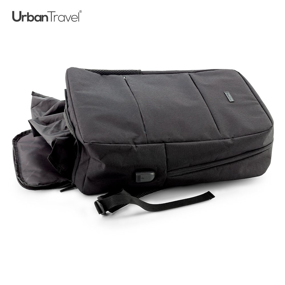 Morral backpack en poliéster. Apto para portátil de hasta 15″. Tres bolsillos externos con cremallera. Un bolsillo lateral en malla. Un bolsillo inferior para zapatos. Puerto USB para cargar desde el interior (no incluye pila).Medidas:42.5 cm x 31 cm x 15 cm.Marca:Láser (incluye placa metálica).