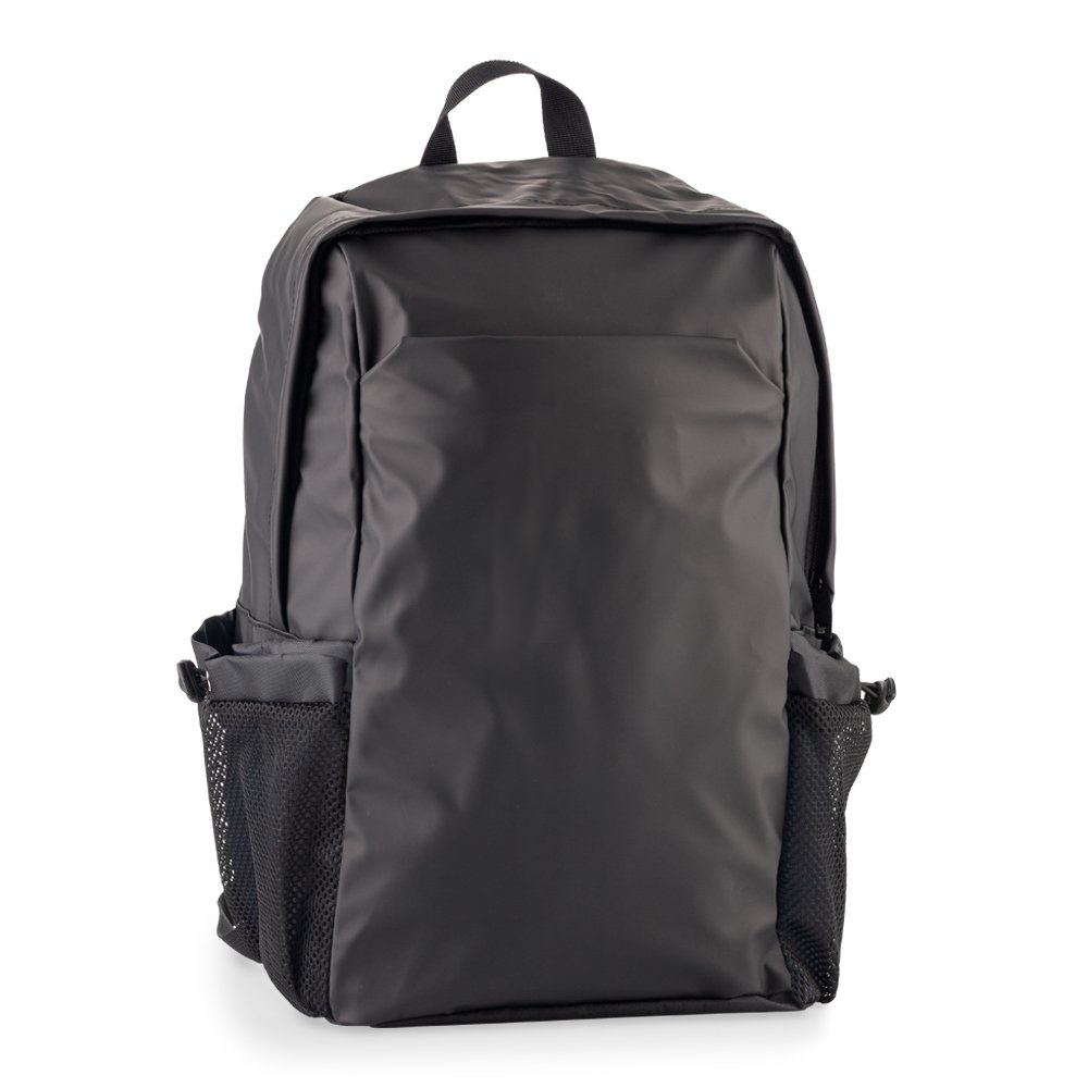 Morral backpack en poliuretano. Dos bolsillos laterales con malla . Apto para portátil de 15”. Espaldar acolchado. Medidas: 43 cm x 30 cm x 12 cm.