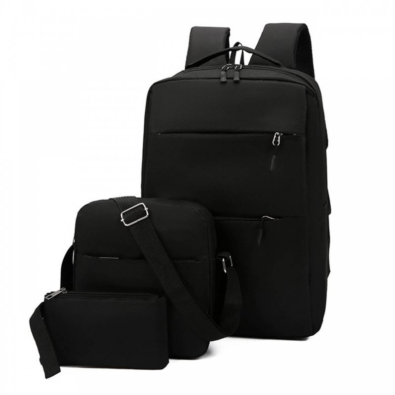Set de Morral con tres servicios + Carriel con dos servicios y Cartuchera. Bolsillos laterales sin cremallera. Bolsillos frontales con cremallera. Bolsillo con velcro para laptop o portátil. Puerto USB y cable para Powerbank. Espaldar y manijas acolchadas. Tamaño del Carriel: 22 x 20 x 5 cm,Tamaño de la Cartuchera: 18 x 11.5 cm