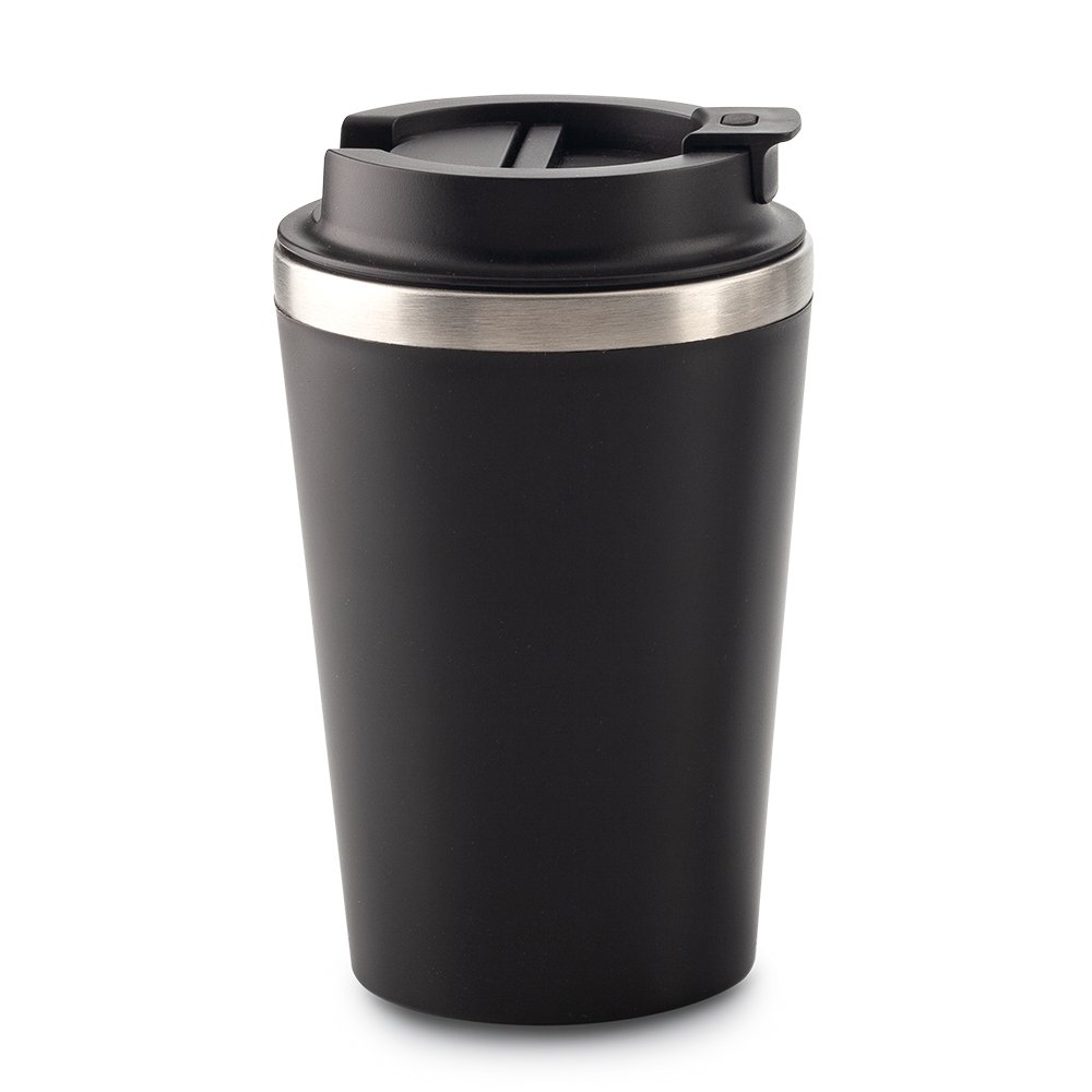 Mug plástico con interior en acero inoxidable. Taparosca de seguridad. Empaque caja individual. Medidas: 12 cm x 5.5 cm.