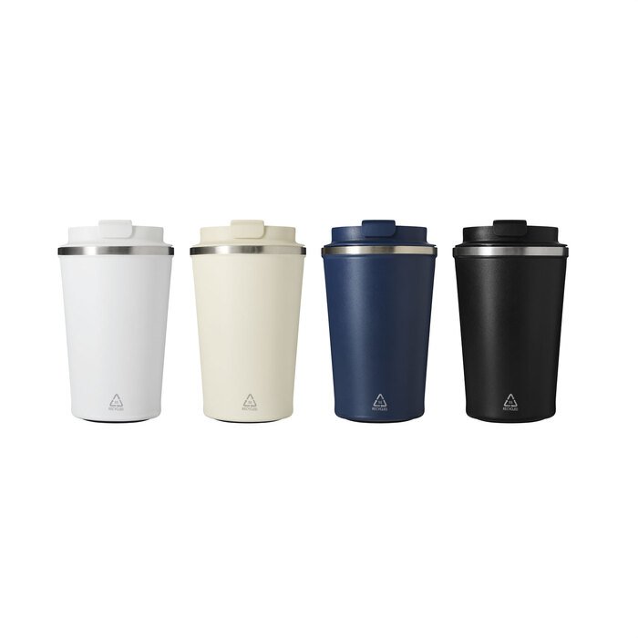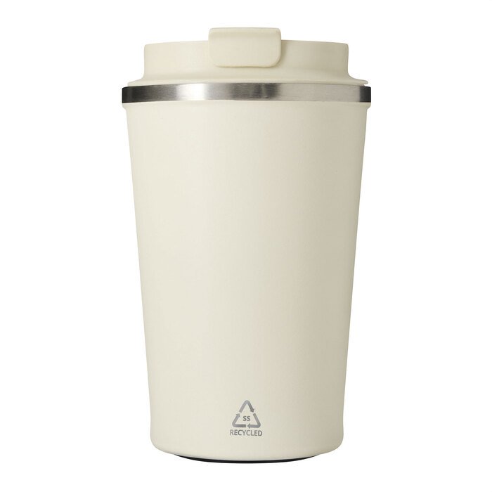 Mug doble pared, sellado al vacío. Aislamiento térmico. Tecnología vacuum. Interior en acero 304 reciclado y exterior en acero 201 reciclado. Tapa de polipropileno a rosca, del mismo color que el vaso, con anillo de silicona y seguro antiderrame. Pintura con acabado mate, textura porosa. Base de silicona antideslizante. Mantiene hasta 8 hs la temperatura de las bebidas calientes y 12 hs de las bebidas frías. Medidas: Ø 9 x 14,5 cm. Capacidad: 350 ml. Materiales: Acero inoxidable reciclado, polipropileno y silicona.