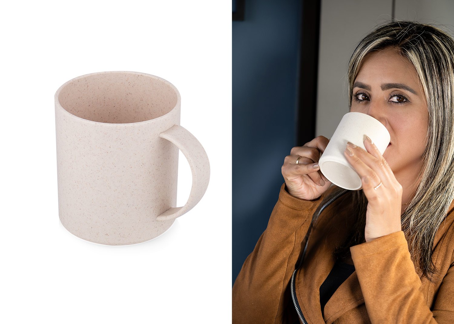 Mug ecológico con asa, hecho con paja de trigo. Capacidad 350 ml / 13 Oz. MATERIAL: PP, Paja de trigo. MEDIDAS: Formato: (Alto X Diámetro): (9 X Ø 5,4). Asa: (9,3). Peso: 63 gr. MARCA: SE SUGIERE: Tampografia con tratamiento