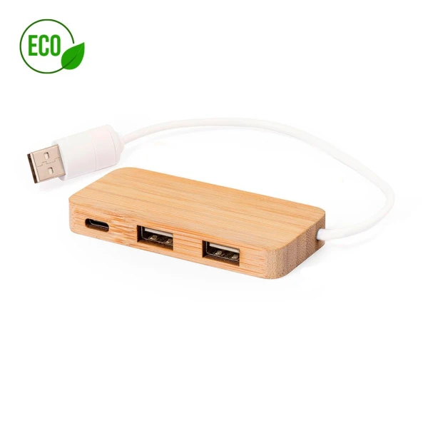 Multipuerto USB 2.0 elaborado en bambú. Incluye 1 puerto Tipo C y 2 puertos USB.  De 7.9 x 1 x 3.7 cm