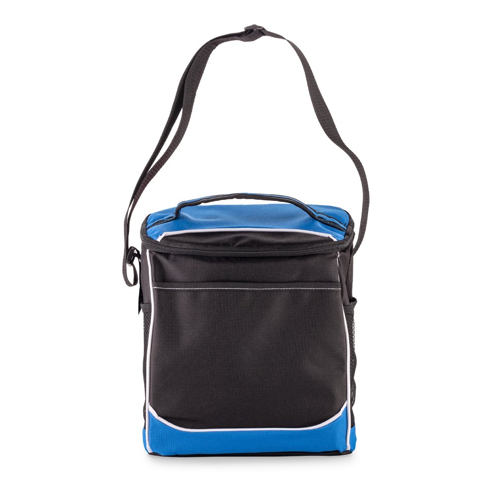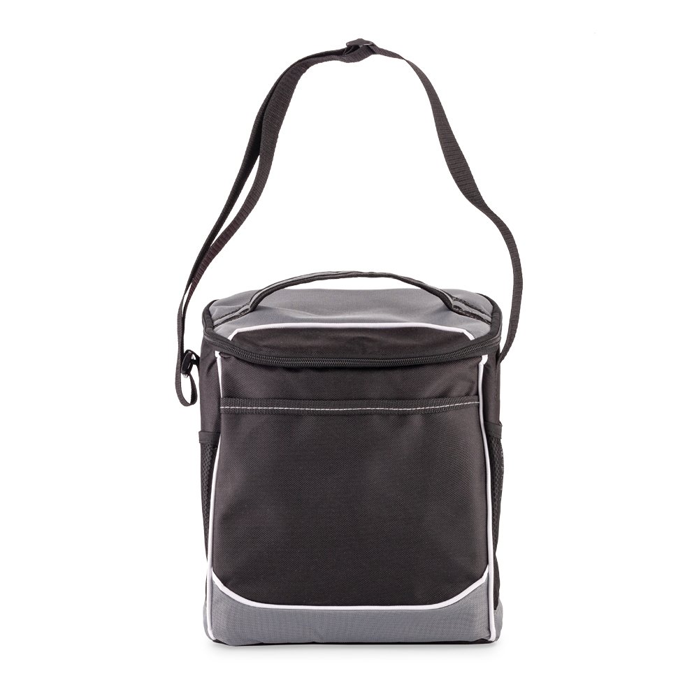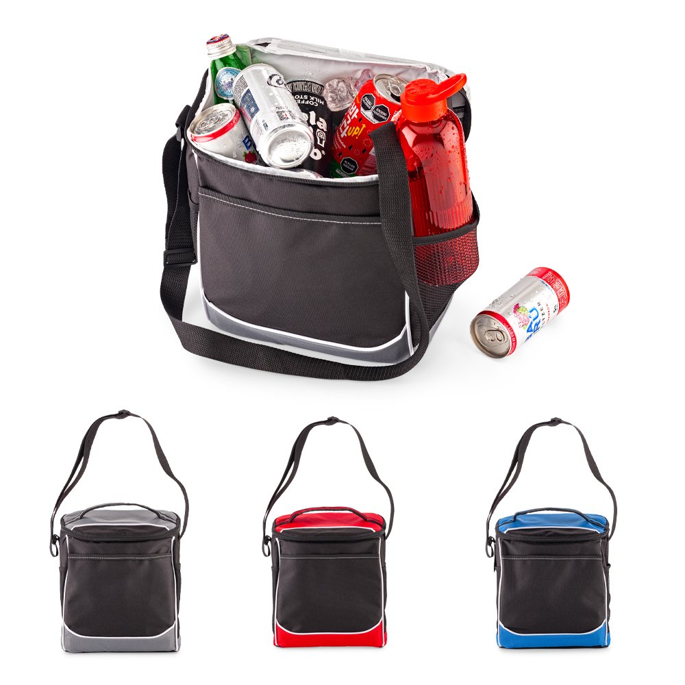 Nevera en poliéster. Con interior en aluminio y dos compartimientos con cremallera. Medidas: 24 cm x 23 cm x 16 cm.