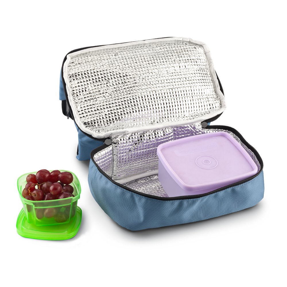 Nevera en poliéster, con interior en aluminio. Dos compartimientos con cremallera. Medidas: 20 cm x 24 cm x 14 cm.