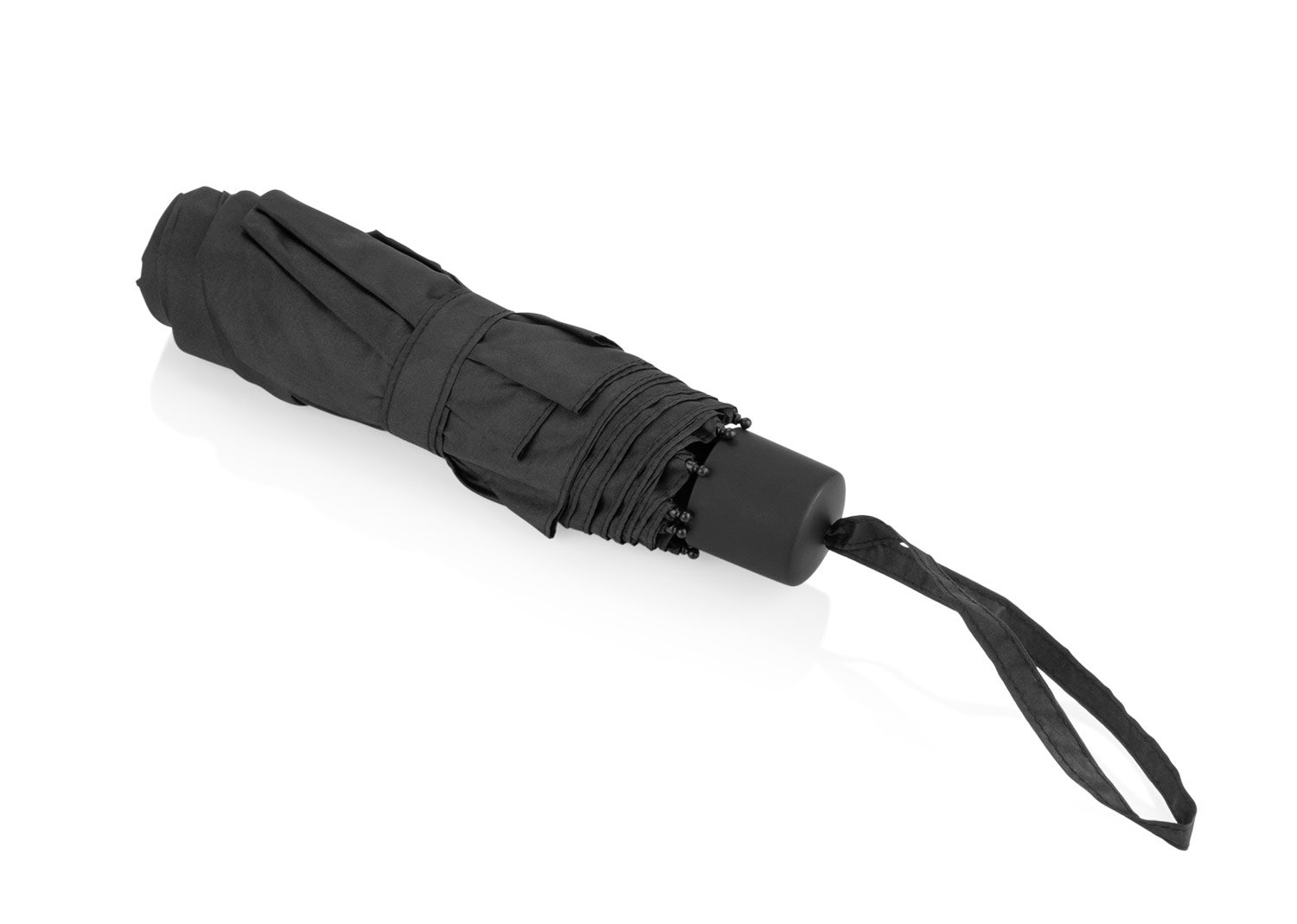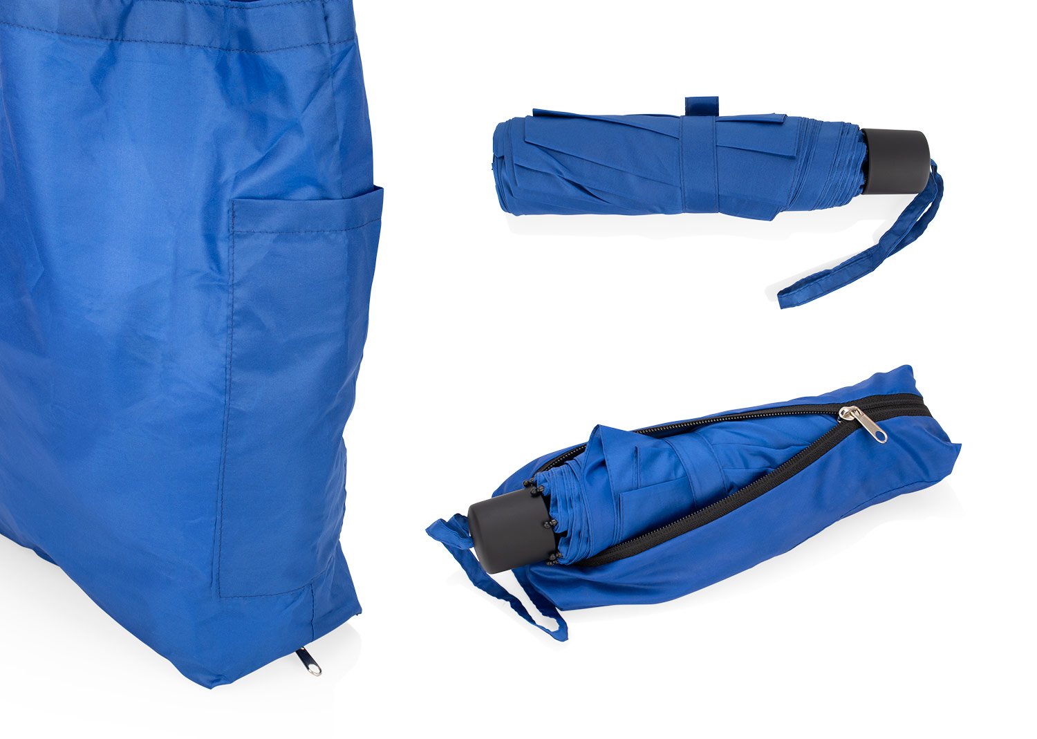 Paraguas plegable de 21 pulgadas con 8 cascos en 3 secciones, apertura y cierre manual completo. Su estructura combina marco chapado negro con 2 secciones de fibra de vidrio, ofreciendo resistencia y flexibilidad. Con tela pongee 190T, cada unidad incluye una bolsa de compras (29,8 X 35 X 11) del mismo material, también a prueba de viento, diseñada para llevar el paraguas junto al bolsillo. El mango es de plástico PP con acabado de goma, cómodo y en colores coordinados. MATERIAL: Pongee 190T + PP + Fibra de Vidrio + Goma, MEDIDAS: Paraguas 21” X 8 Cascos: (38). Cobertura: Ø (110,5). Largo: (56,5). Diámetro Vara: (0,8). Peso: 105 gr.