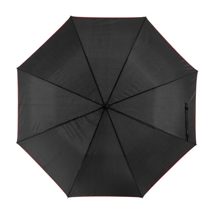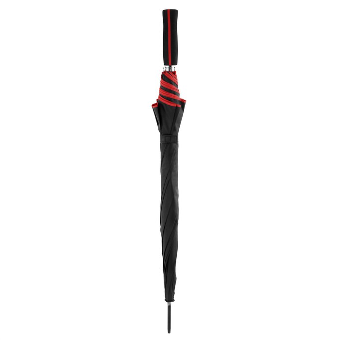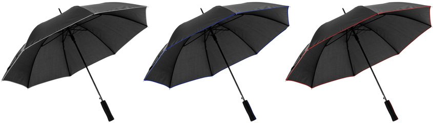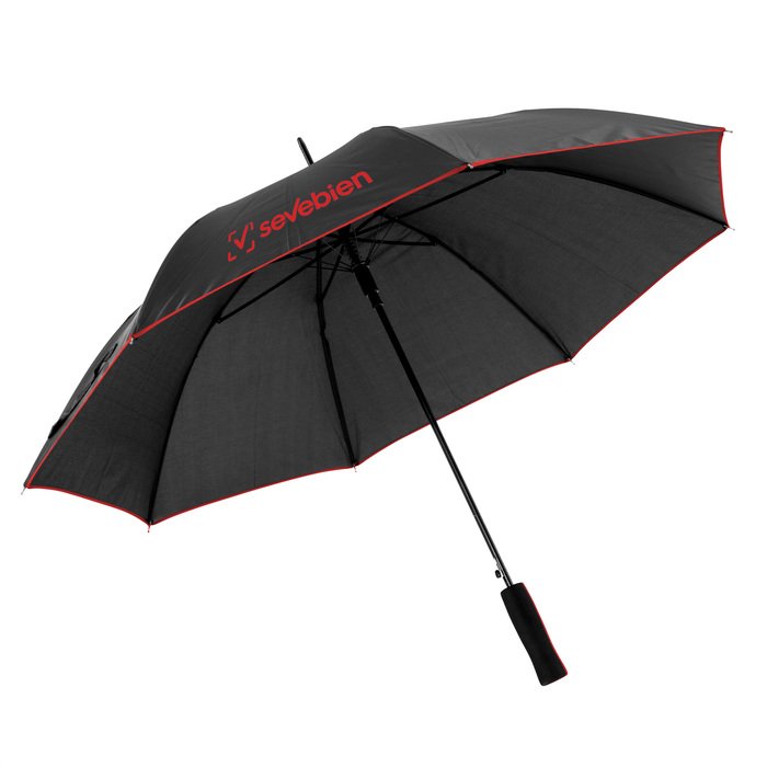 Paraguas  APERTURA AUTOMÁTICA Y CIERRE MANUAL. Eje y varillas metálicas. Mango de goma eva de doble color. Botón a presión. Cubierta y funda de poliéster. Cierre con correa de velcro. Medidas: Ø 105 cm. 8 gajos. Ancho gajo 40 cm. Largo total 83 cm.  Materiales: Poliéster 190T, metal y plástico engomado.