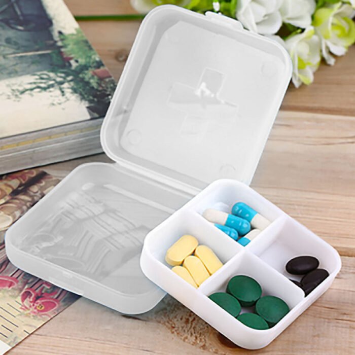 Pastillero plástico. 4 compartimentos removibles. La tapa tiene una cruz médica en alto relieve. De 6.5 x 6.5 x 2.3 cm.Impresión: Tampografía.