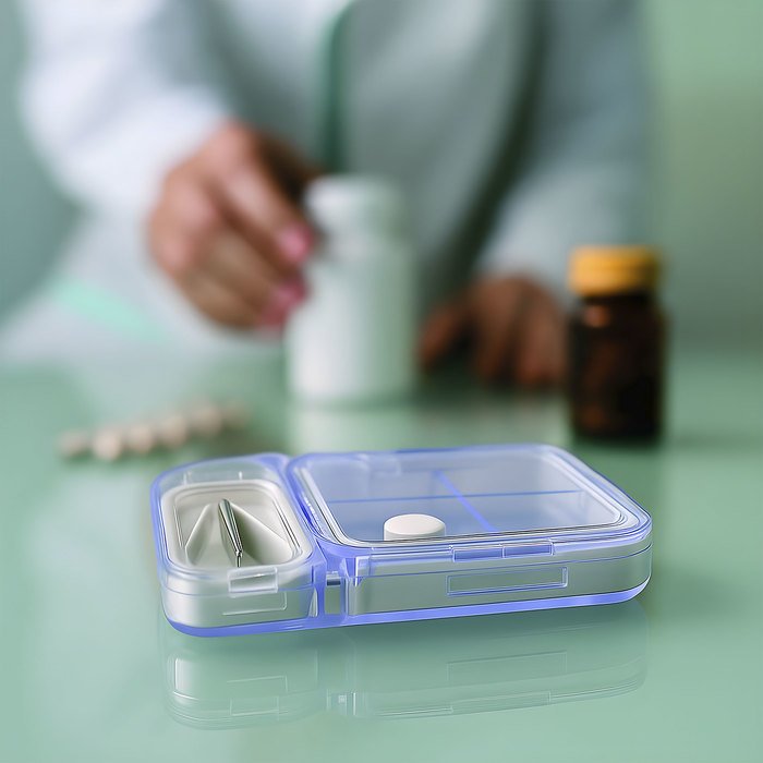 Pastillero organizador corta pastilla. Compartimento principal con cuatro divisiones y recubrimiento perimetral de silicona. Compartimento secundario con base de silicona y soporte regulable de pastillas. Cuchilla de acero incorporada en la tapa. Ambos compartimentos con tapa rebatible y cierre a presión. Medidas: 12 x 6,3 x 1,8 cm Materiales: Plástico AS, silicona y acero inoxidable 420J2 (grado alimenticio)