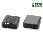 Pila recargable de emergencia de 5000 mAh con luz led. Cables con conectores lightning, Micro, USB y Tipo C, con alimentación de energía mediante puerto USB, Tipo C, Micro. 4 luces indicadoras del estado de carga. Empaque Caja Individual. Medidas: 8 cm x 9 cm x 2 cm. Marca: / Tampografía