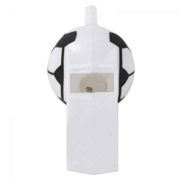 Pito plástico con cordón. Colores: Blanco con motivo de balón de fútbol. Medidas: 5 cm x 1.8 cm. Impresión: Tampografía.