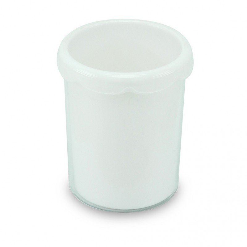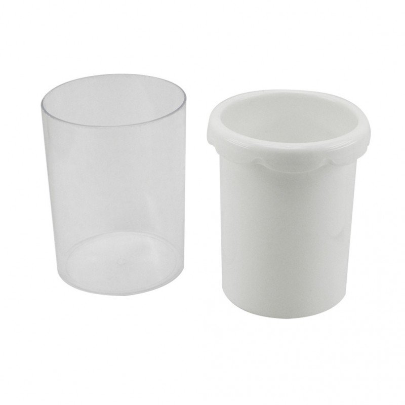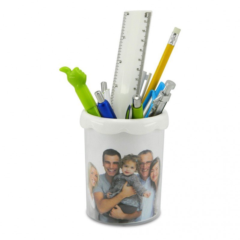 Porta esfero de dos cuerpos para insertar publicidad impresa, personalizable. Alto 10.3 cms, diámetro 8.5 cms. Material: Plástico. Tipo de impresión: Etiqueta en Papel.