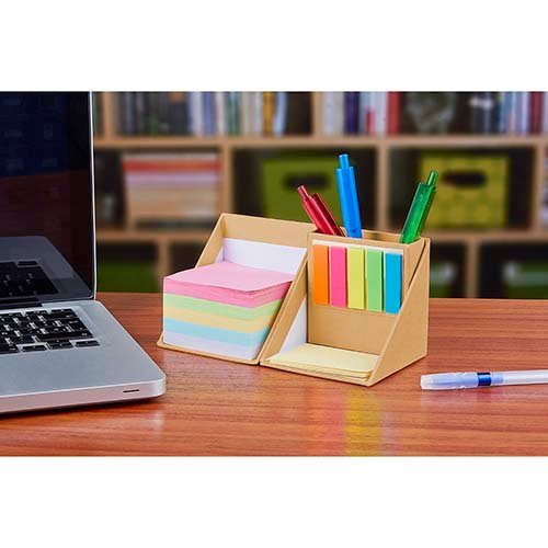 Incluye porta plumas, 500 notas de diferentes colores, 25 notas adheribles amarillas y 5 banderas adheribles de diferentes de colores. CATEGORÍA: ARTICULOS DE OFICINA MATERIAL: Cartón / Papel TAMAÑO: 8.6 x 8.6 cm COLORES: Beige CAPACIDAD: COLOR DE TINTA: INFORMACIÓN DE IMPRESIÓN TÉCNICA: Serigrafía AREA: 6 x 6 cm INFORMACIÓN DE EMPAQUE MEDIDA: 22 x 49 x 20.5 cm. PESO: 7.40 kgs. CANTIDAD: 20 pza(s).