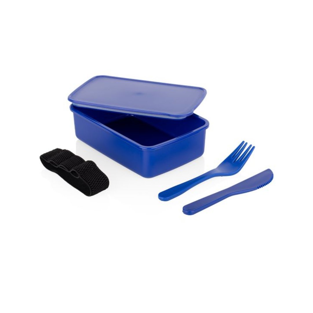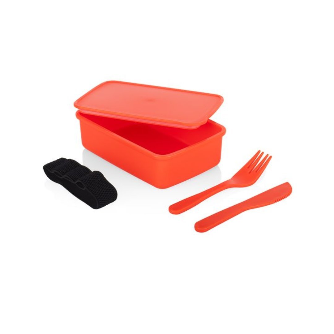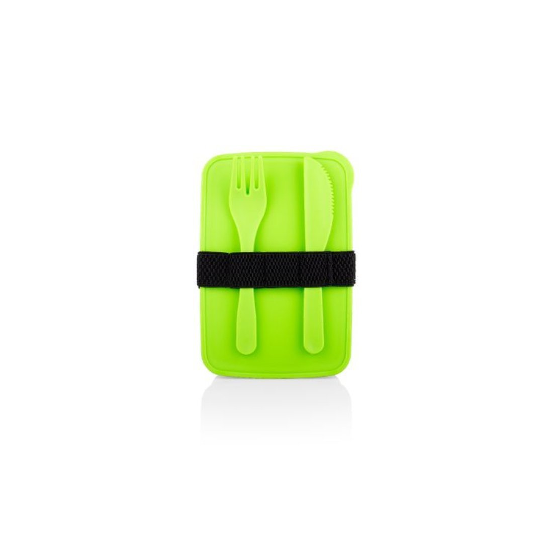 Portacomidas rectangular con banda de seguridad negra. Incluye cuchillo y tenedor. MATERIAL: 100% PP/ banda goma de Poliéster / Silicona, MEDIDAS: 11 X 5 X 16,5, ÁREA DE IMPRESIÓN APROXIMADA: Tampo: 7 X 4,5 cm en la tapa, MARCA: SE SUGIERE: Tampografia silicona hasta 1 tinta