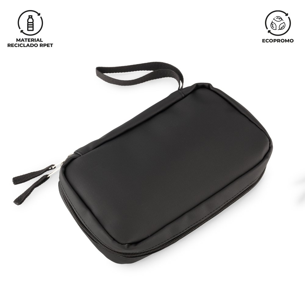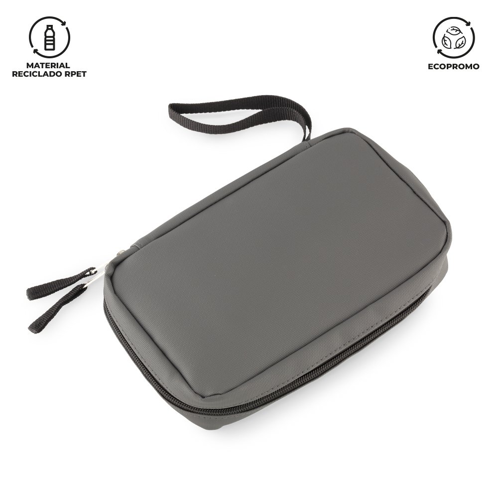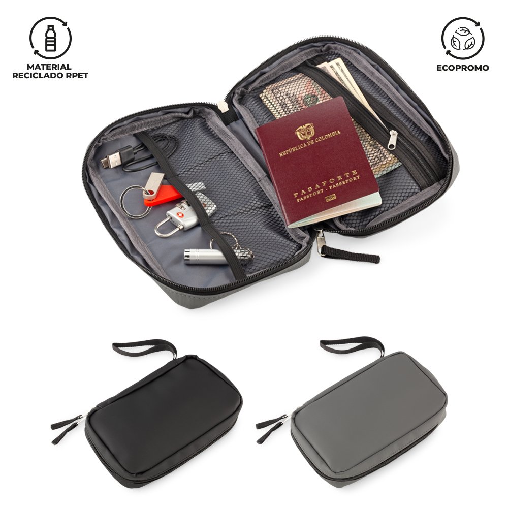 Portadocumentos en poliuretano reciclado RPET. Con organizador de cables y un bolsillo con cremallera. Medidas: 22 cm x 13 cm x 4 cm.