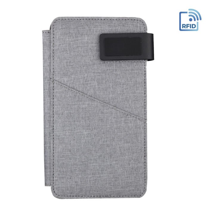 Portadocumentos en lona poliéster con cierre de imán. Su material interno permite bloquear las señales electromagnéticas RFID (Radio Frequency Identification) que se usan en tarjetas de chip, pasaportes, tarjetas electrónicas de transporte, etc. Medidas: Cerrado: 11.5 cm x 20 cm