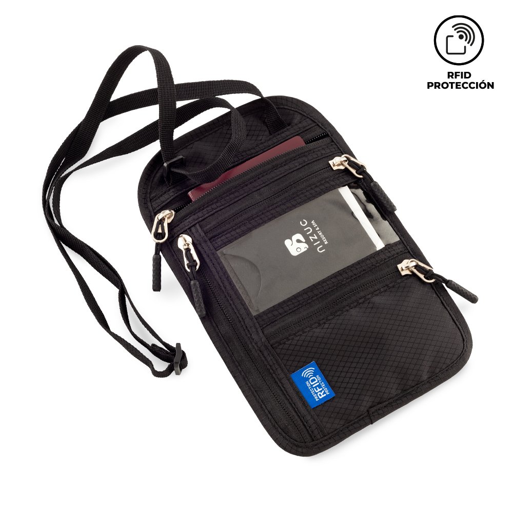 Portadocumentos para viaje en lona poliester, con 4 bosillos externos con cremallera y un bolsillo en la parte posterior. Su material interno permite bloquear las señales electromagnéticas RFID (Radio Frequency Indentification) que se usan en tarjetas de chip, pasaportes, tarjetas electrónicas de transporte, etc. Medidas: 24 cm x 15 cm.