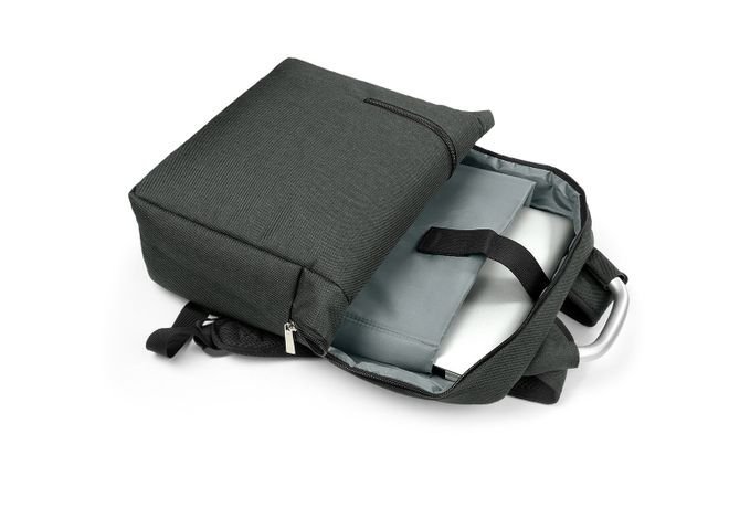 Morral con agarradera en Aluminio y cargaderas acolchadas, bolsillo principal con doble cremallera y compartimento con velcro para portátil de 14″, bolsillo interior para bolígrafo y libreta. Bolsillo frontal con cierre de cremallera. Incluye placa metálica para marca láser.