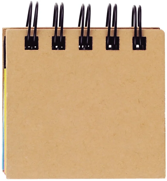 7,5 x 2 x 7 cm Cartón. Material reciclado. 5 blocs de 25 notas adhesivas rectangulares grandes. 5 blocs de 25 notas adhesivas rectangulares chicas estilo banderitas. Anillado metálico. Marca Tampografía una tinta