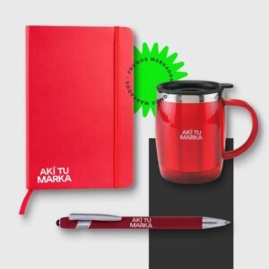 Set de libreta de 21 cm x 14.5 cm de 96 hojas rayadas con cubierta en poliueretano, mug de 500 ml, doble pared en acero Inoxidable, con aislamiento térmico que mantiene la bebida fría o caliente hasta 6h aprox (puede variar dependiendo de condiciones climáticas), tapa pestaña y grip de silicona para mejor agarre. Bolígrafo metálico roller. Empaque caja individual.