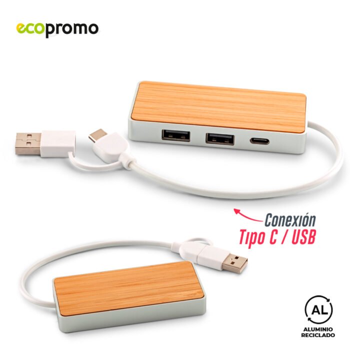 Puerto USB en bambú y acero reciclado con doble conexión Tipo C y USB. Dos puertos USB y uno Tipo C. Empaque caja individual.Medidas: 8.5 cm x 4 cm x 1 cm.Marca:Láser.