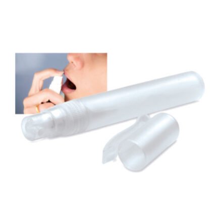 Envase traslúcido con enjuague bucal. Tapa para colgar tipo bolígrafo. De 12,5 X 1,5 cm de diámetro.Impresión: Tampografía con tratamiento.