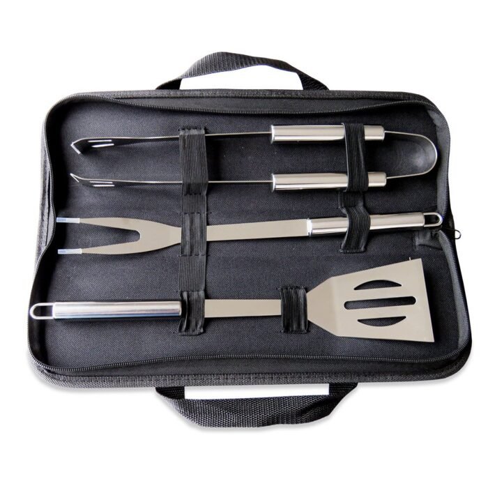 Set de BBQ con 3 utensilios metalicos (pinzas trinche espatula) Estuche en lona con cierre de cremallera Medidas:Estuche cerrado: 40 cm x 12 cm x 5 cmMarca:10 cm/Screen – IMPORTANTE: Antes de realizar el pedido, verificar existencias con su asesor.
