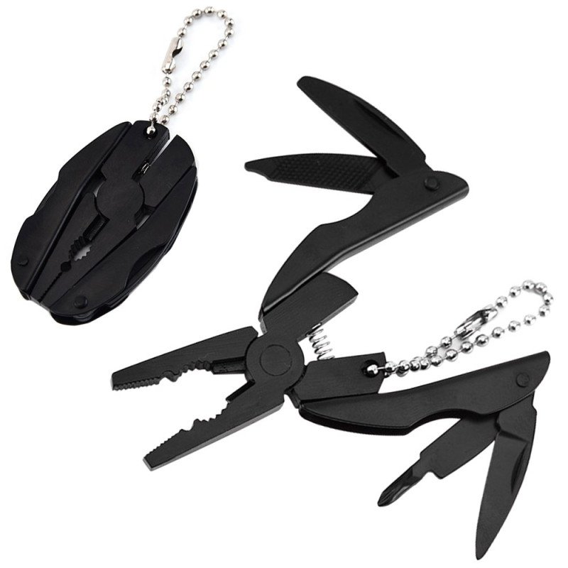 Herramientero 7 funciones en acero inoxidable color negro, con estuche en lona. De 8 x 5.5 x 2 cm desplegado.Impresión: Screen, tampografia metálica, láser