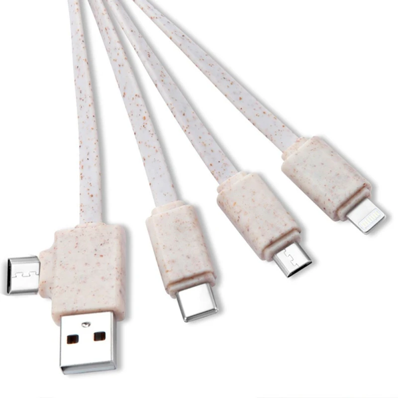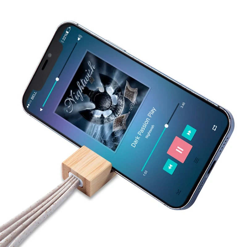 Set de carga tipo llavero con cable tipo C, Micro USB y Lightning. 5V DC 2.4A. Soporte para teléfono móvil. Fabricado en resistente bambú.