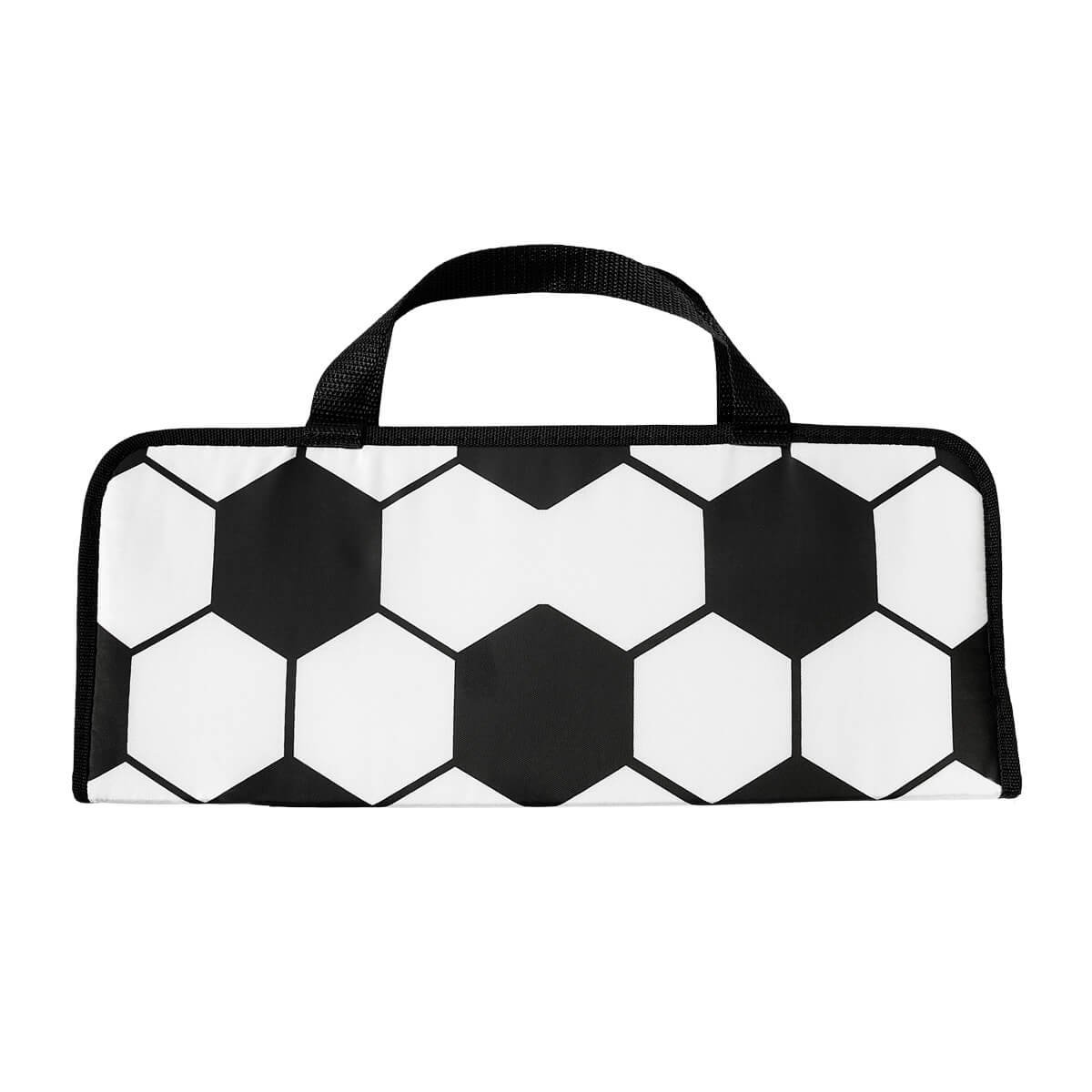 Maletin con cierre y asa con diseno soccer. Incluye pinzas, tenedor y espatula. TAMAÑO: 40 x 15 cm MATERIAL: Acero Inoxidable Utensilios / Poliester Estuche