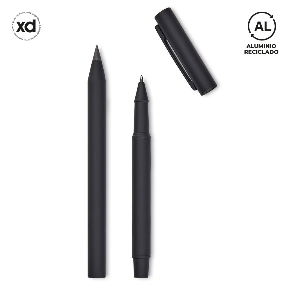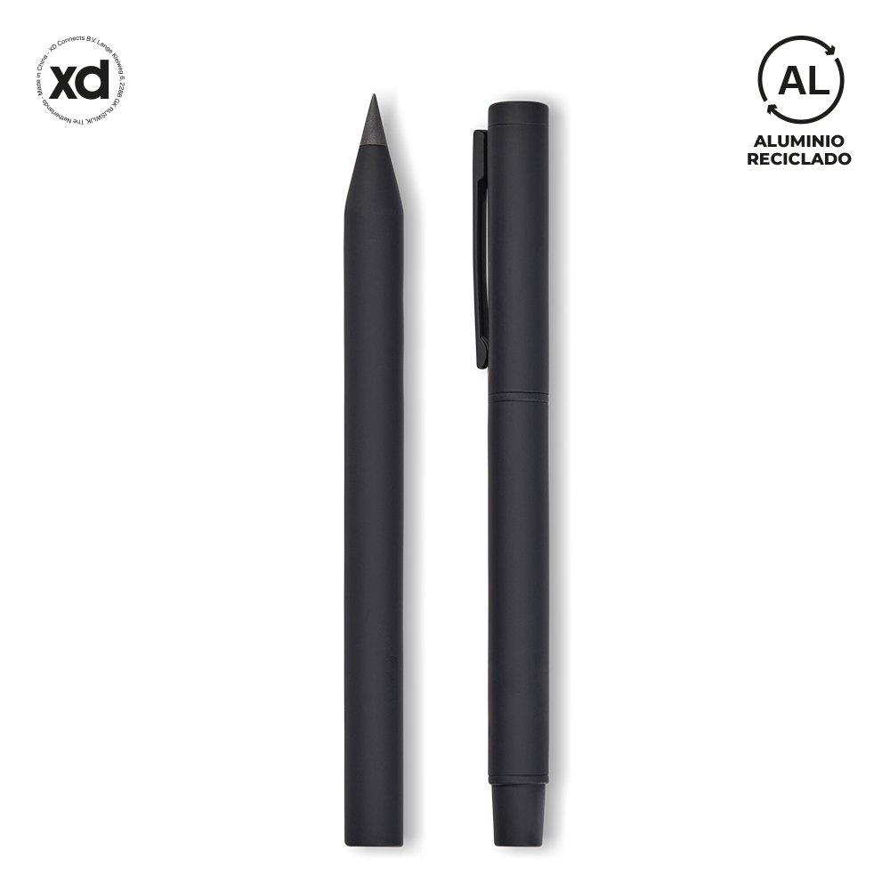 Set de bolígrafo en aluminio reciclado con tapa y lápiz con mina infinita (mina eterna). Empaque caja individual.Medidas Caja: 17 cm x 5.8 cm x 2.3 cm.Bolígrafo – Lápiz: 14 cm.