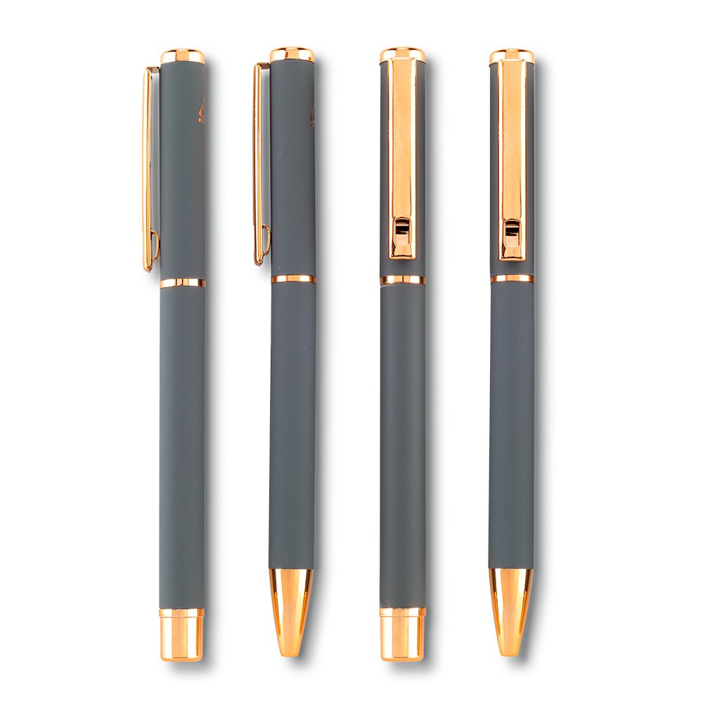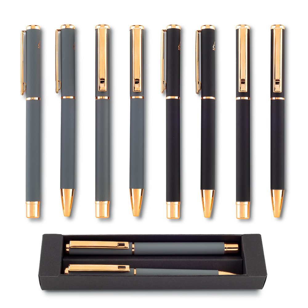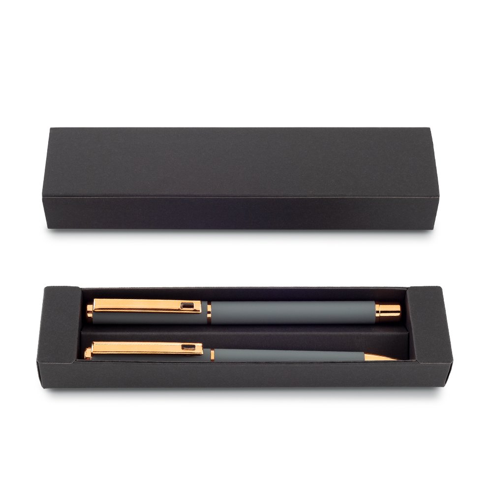 Set de bolígrafos metálicos tipo roller y mecanismo twist. Empaque caja individual.Medidas: Caja 17 cm x 4 cm x 2 cm. Bolígrafos: 13.5 cm.