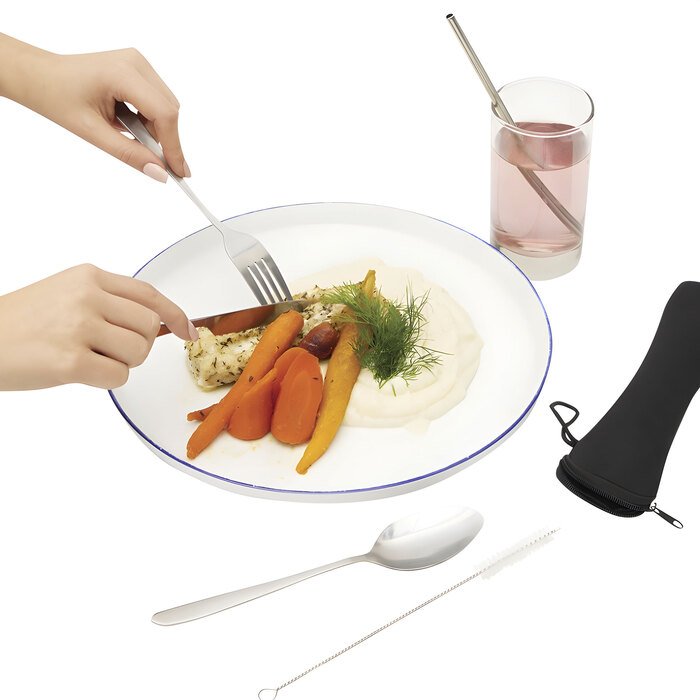 Set de cubiertos. 5 elementos: Cuchara, tenedor y cuchillo en acero 430; Pitillo y cepillo para pitillo en acero 304. Estuche de eva con cierre y correa de poliéster, color negro. Medida estuche: 7 x 21,5 cm. Materiales: Acero inoxidable, eva y poliéster.