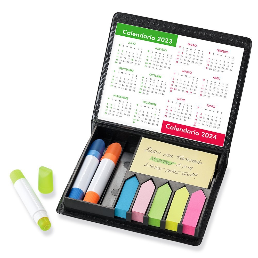 Estuche en plastico con tapas en imitacion cuero (PU) calendario 5 stickies de colores surtidos de 200 unidades cada uno un taco de papel adhesivo amarillo de 100 hojas y 3 resaltadores en cera (Azul/Naranja/Amarillo) Empaque caja Individual Medidas: Cerrado: 10 9 cm x 13 cm x 2 9 cmAbierto: 21 cm x 13 cm x 2 9 cmMarca: 7 cm / Screen / Repujado – IMPORTANTE: Antes de realizar el pedido, verificar existencias con su asesor.