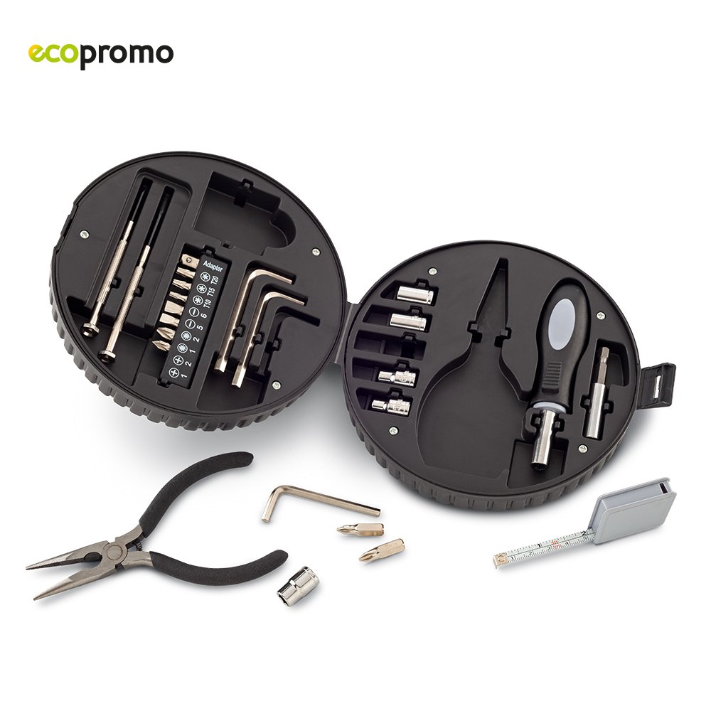Set de herramientas de 24 piezas en estuche plástico y bambú. Cierre a presión. Empaque caja individual. Medidas Cerrado: 5.5 cm x 16 cm diámetro.
