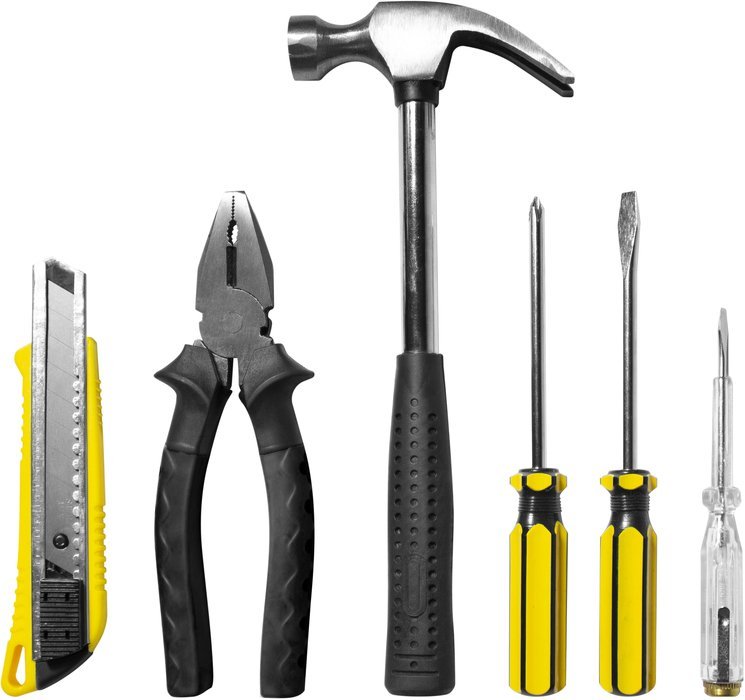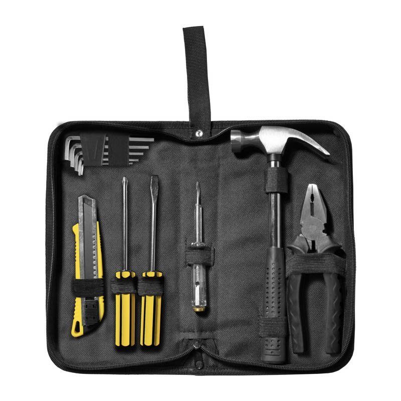 27 x 14 x 4,5 cm. (cerrado) /27 x 32,2 x 4,5 cm. (abierto) Poliéster 600D Oxford. Set de herramientas en estuche con cierre y cremallera. Contiene 11 piezas, todas sujetadas con elastico anti deslizante: Cuter, pinza alicate, martillo, 2 destornilladores de diferentes puntas (punta plana y punta phillps), un destornillador tester y 5 llaves allen. Presentación en caja de regalo.Familia de 5 llaves Allen: acero 45# de espesor
