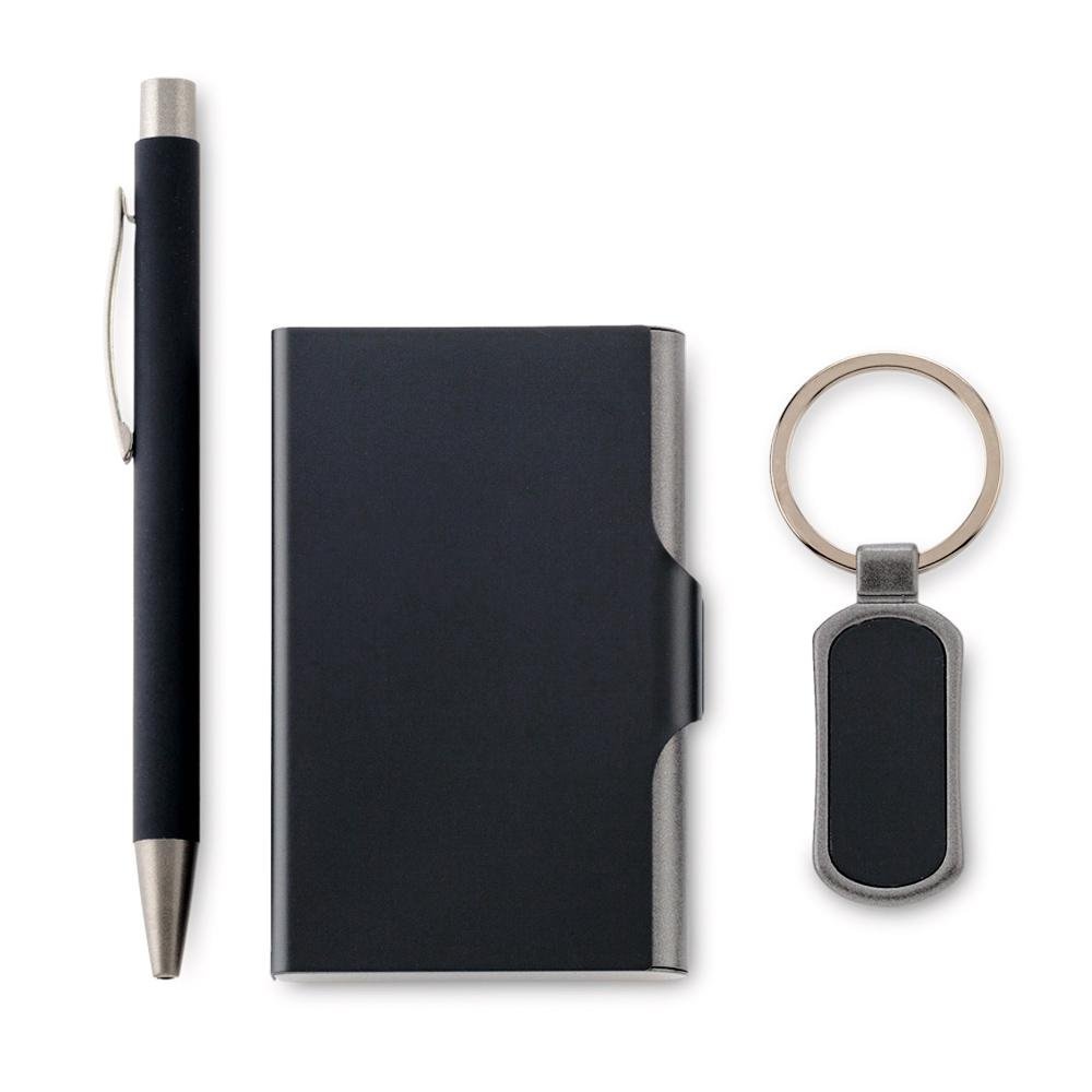 Metalico Caja negra individual Medidas: Estuche: 15 8 cm x 12 8 cm x 2 7 cm Llavero: 4 5 cm x 2 2 cmBoligrafo: 13 5 cm Portatarjetas: 9 5 cm x 6 4 cm x 1 3 cmMarca: Llavero: 2 5 cm Portatarjetas: 5 cm Boligrafo: 2 5 cm / Laser – IMPORTANTE: Antes de realizar el pedido, verificar existencias con su asesor.