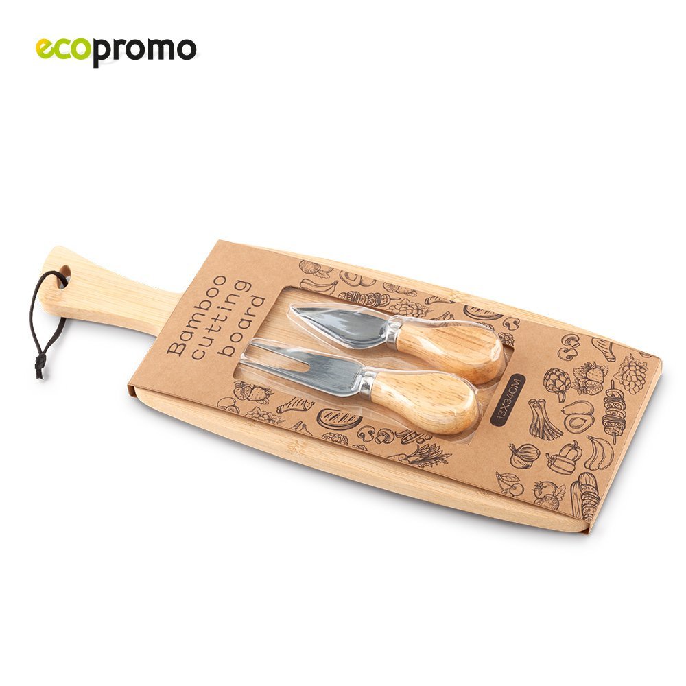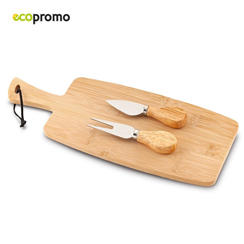 Set con tabla para cortar en bambú y dos accesorios. Medidas: 12 cm x 25.5 cm x 1 cm (la medida no incluye la manija) . Marca: 7 cm / Láser