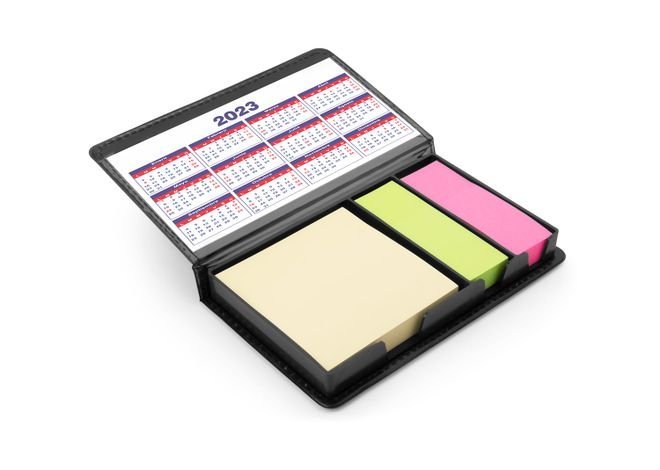 Set de memos adhesivos y 2 juegos de bandras adhesivas de color con 120 hojas cada uno. Incluye calendario.