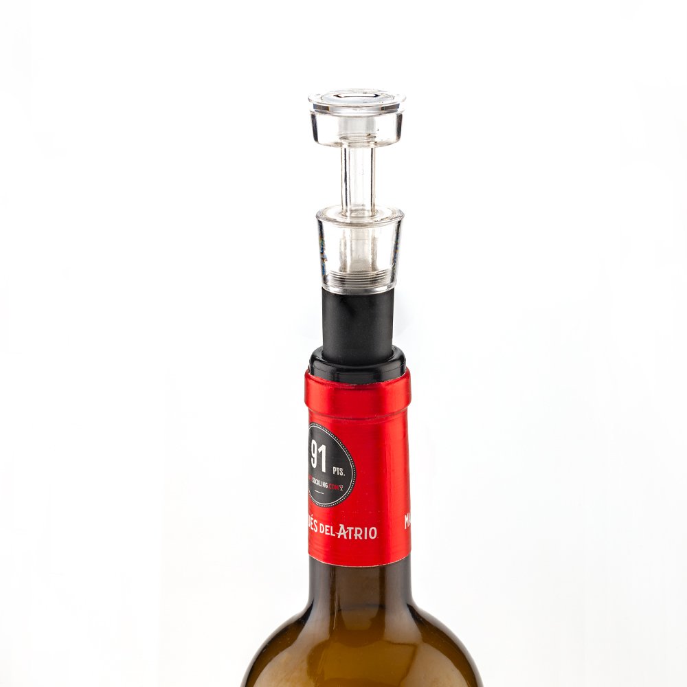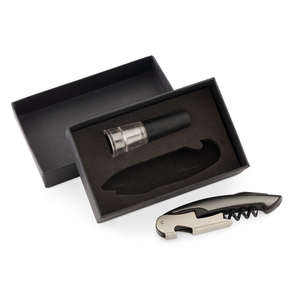 Set de vino con descorchador y tapón de vacío. Empaque caja individual. Medidas Caja: 15 cm x 9.5 cm x 3.7 cm.