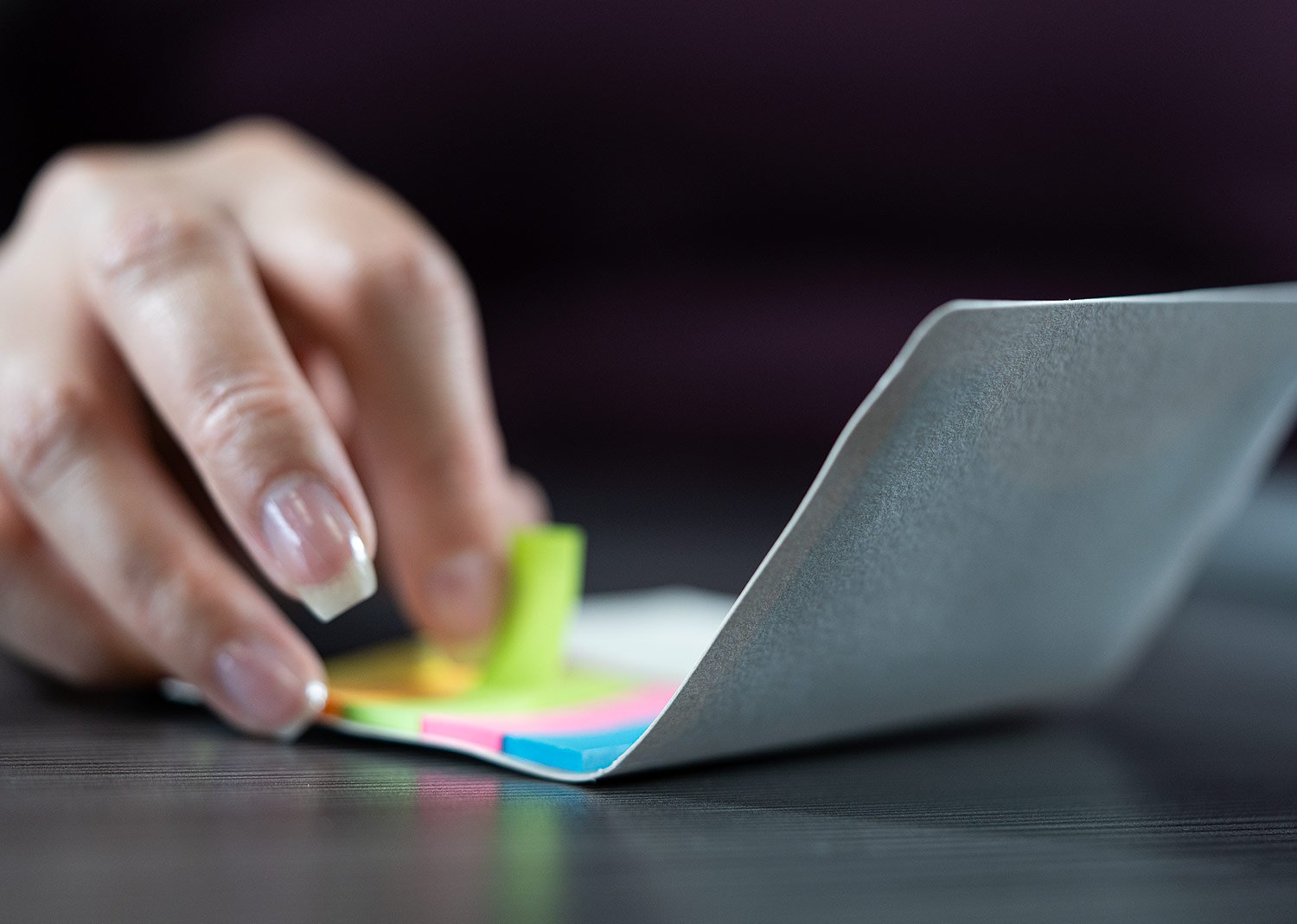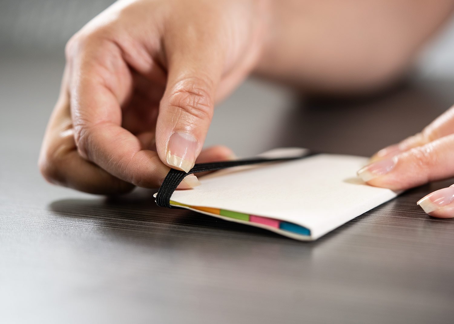 Set de memos elaborados en material recuperado de cajas Tetra pak. Incluye 5 juegos de banderas adhesivas en papel de colores de 25 hojas cada uno, además, tiene espacio para las tarjetas y una banda elástica en el cierre.