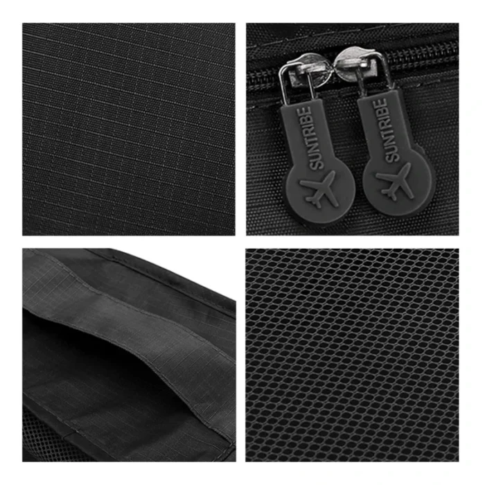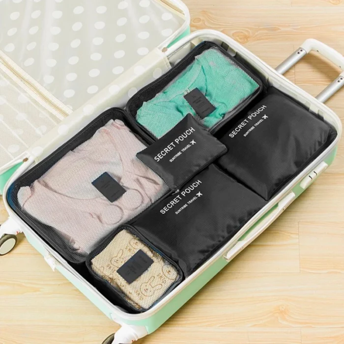 Set de 6 bolsas organizadoras para viaje en poliéster impermeable y cierre de cremallera. Bolsa con malla pequeña de 19 x 15 x 10.5 / Mediana: 29.5 x 22 x 9.6 cm / Grande: 38 x 27 x 10.8 cm. Bolsa en tela pequeña de 16.3 x 13 cm / Mediana: 26 x 18.5 cm / Grande: 31.5 x 22 cm
