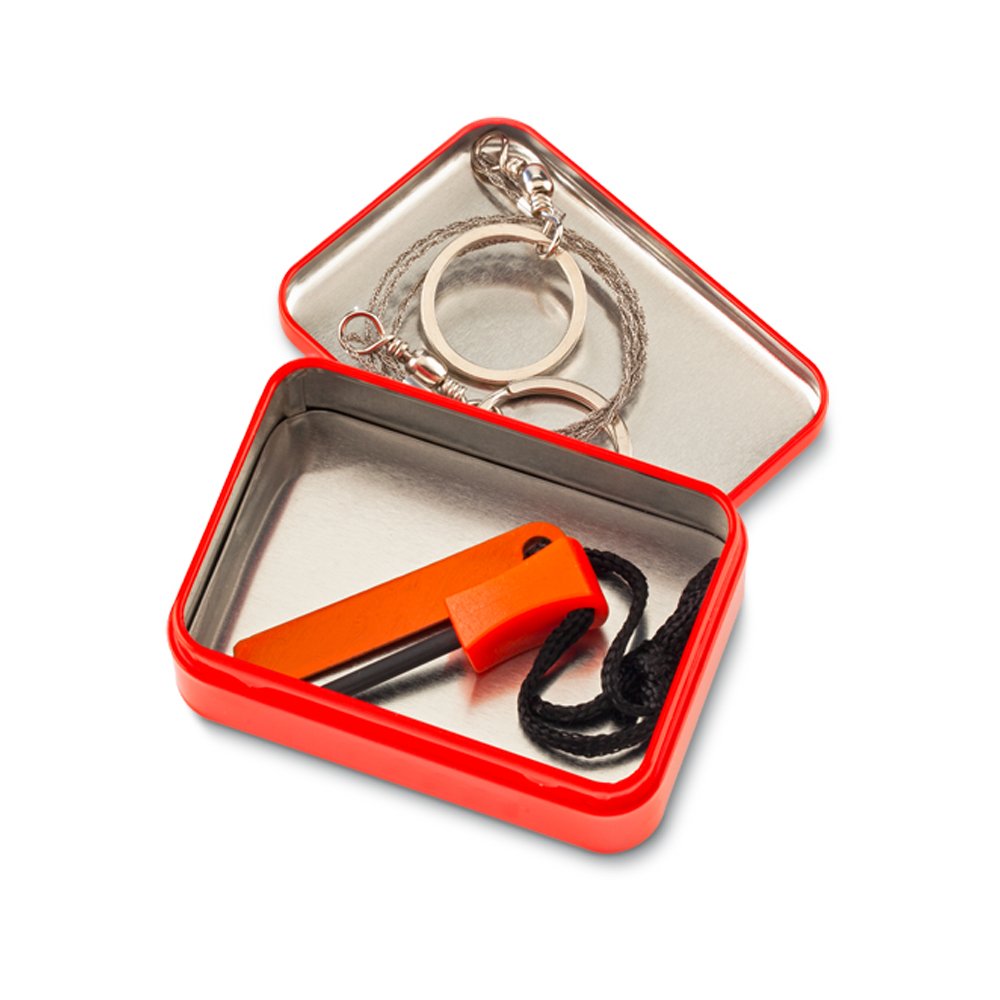 Set de supervivencia (SOS). Incluye caja metálica y 6 diferentes accesorios: silbato, alicates multifunción con luz LED, mini brújula, tarjeta de supervivencia de acero con funda, iniciador de fuego y cordón de sierra. Empaque caja individual. Medidas: 9.5 cm x 6.5 cm x 3 cm.