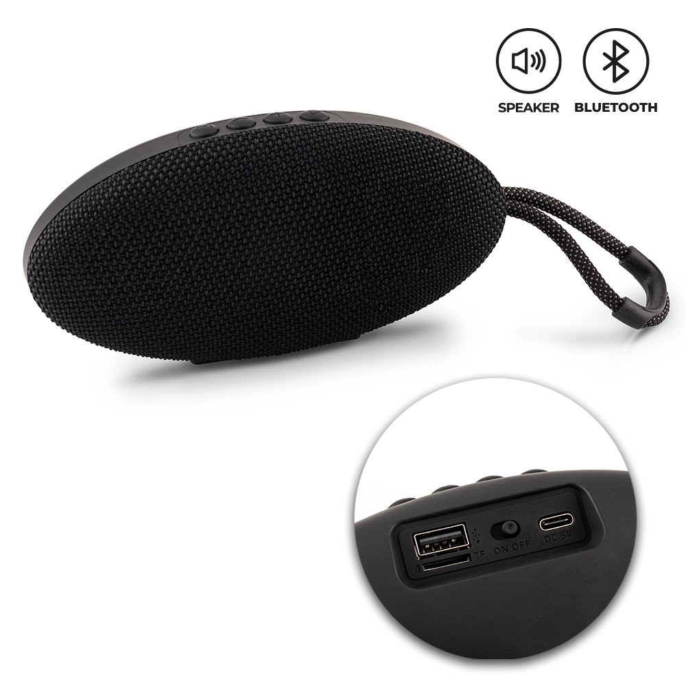 Speaker Bluetooth plástico recubierto en tela. Tiempo de reproducción: 3-4 horas. Batería: 1200 mAh. Potencia: 5W. Incluye cargador inalámbrico de 5W. Lector de tarjeta TF y USB (no incluidas). Puerto Tipo C para carga. Empaque caja individual. Medidas: 10.8 cm x 8.2 cm diámetro.