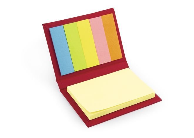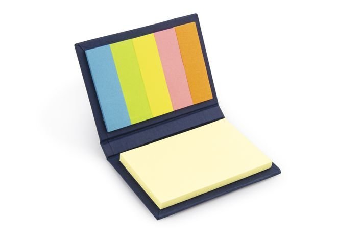 Set con taco de memos amarillos de 50 hojas y 5 tacos de banderas adhesivas en papel de colores de 25 hojas c/u. Tapa dura. Tamaño aproximado de las hojas: A8.